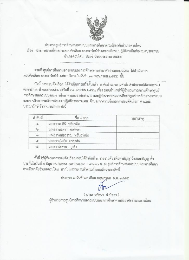 ประกาศรายชื่อรายชื่อผลการคัดเลือก บรรณารักษ์จ้างเหมาบริการ ปฏิบัติงานในห้องสมุดประชาชน อำเภอควนโดน จังหวัดสตูล