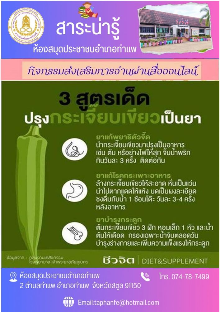 นายอาดำ ลิงาลาห์ ผู้อำนวยการสถานศึกษาศูนย์ส่งเสริมการเรียนรู้ระดับอำเภอท่าแพ จังหวัดสตูล มอบหมายให้นางสาวพัชรี ยอดราช บรรณารักษ์ ส่งเสริมการอ่านผ่านสื่อออนไลน์ "3 สูตรเด็ด ปรุงกระเจี้ยบเขียวเป็นยา" การอ่าน เปิดประตูสู่ความรู้ที่ไม่สิ้นสุด ณ ห้องสมุดประชาชนอำเภอท่าแพ จังหวัดสตูล