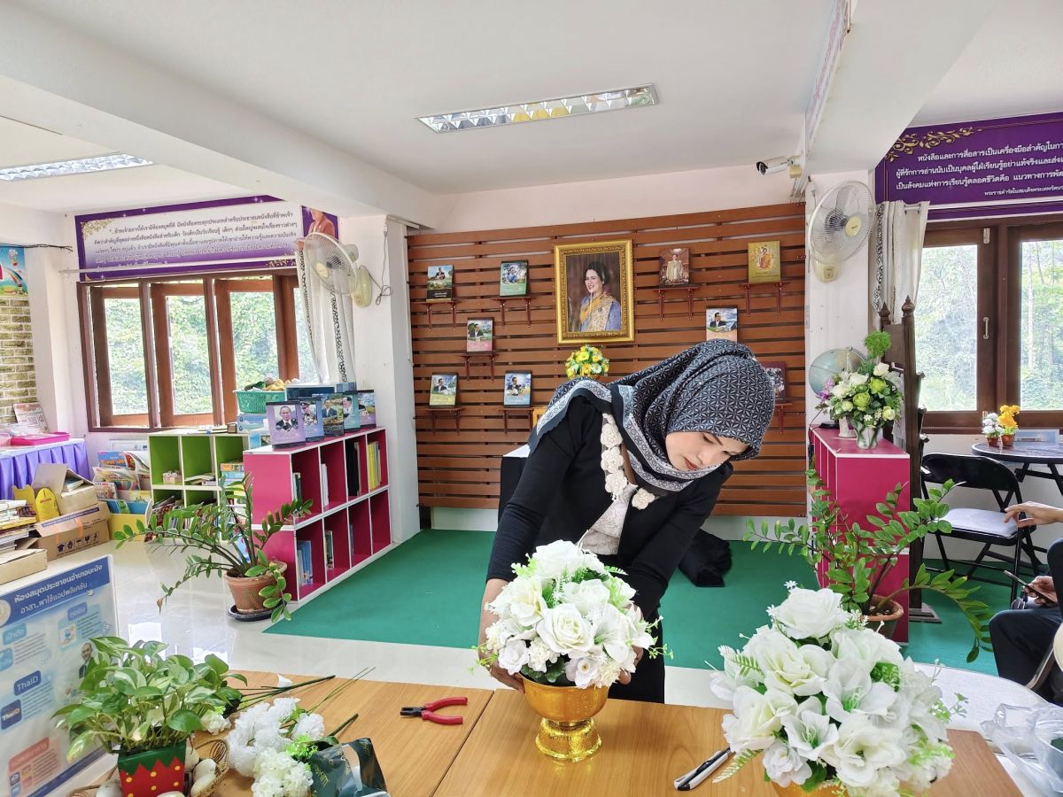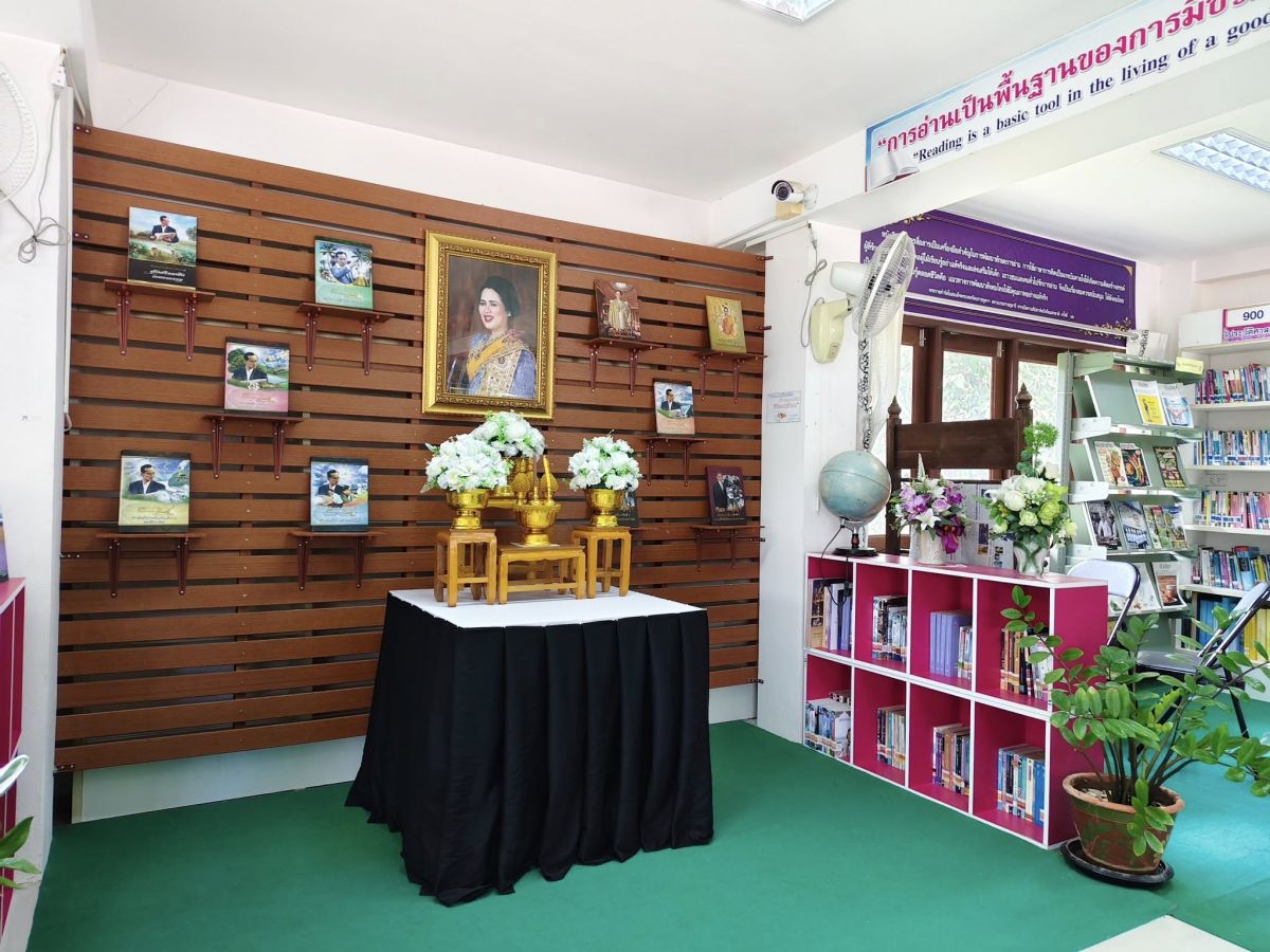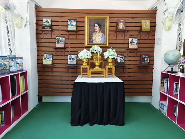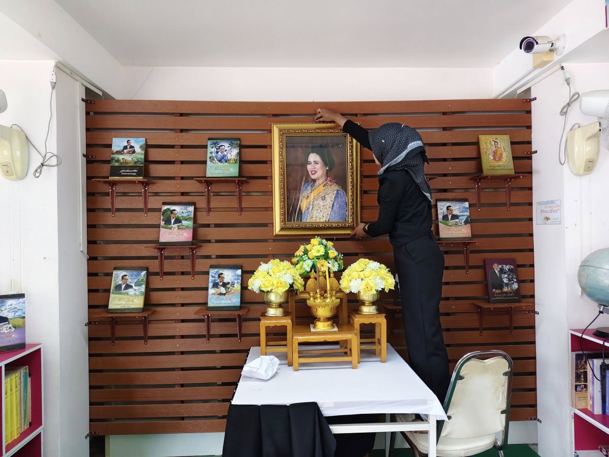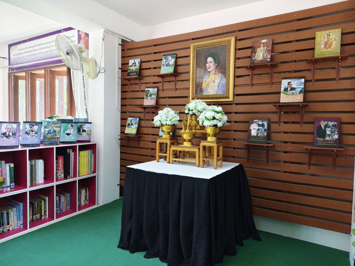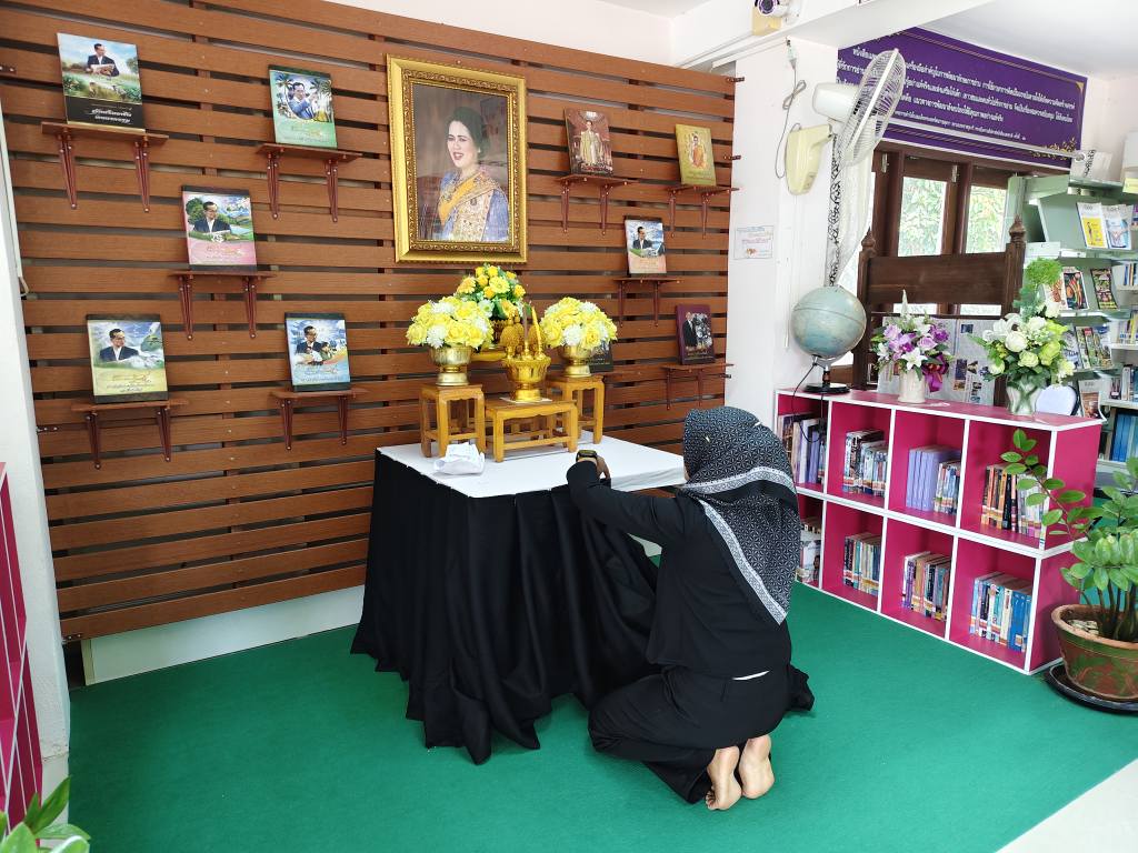 ห้องสมุดประชาชนอำเภอมะนัง จัดตกแต่งสถานที่ประดับพระบรมฉายาลักษณ์สมเด็จพระนางเจ้าสิริกิติ์ พระบรมราชินีนาถ พระบรมราชชนนีพันปีหลวง ประดับผ้าระบายสีขาวดำ