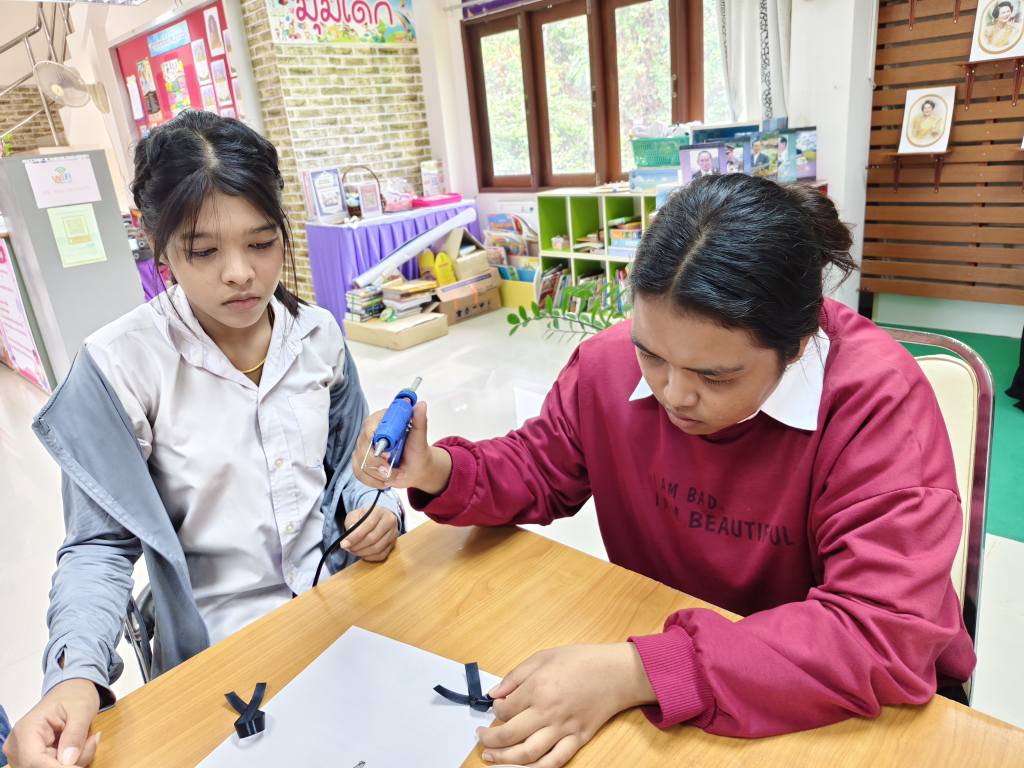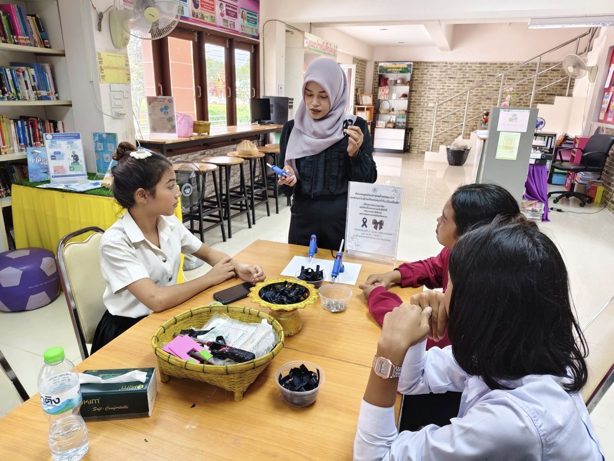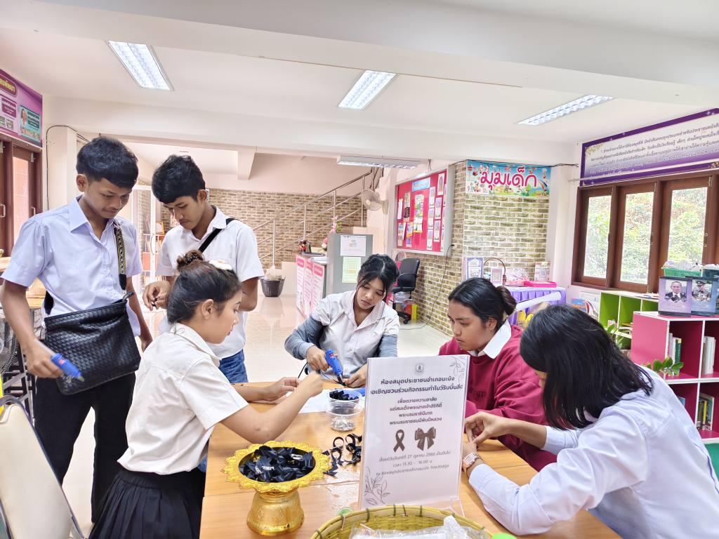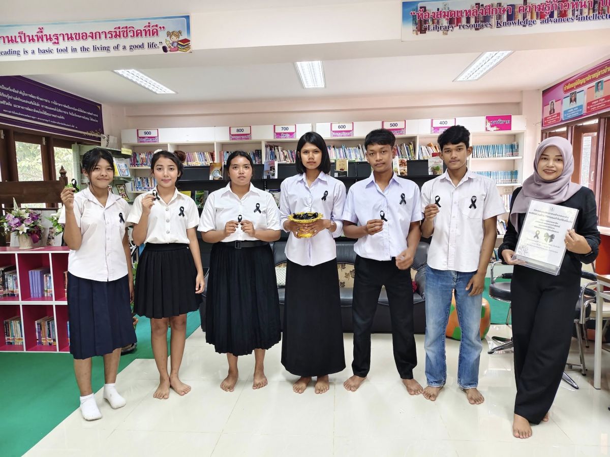 ห้องสมุดประชาชนอำเภอมะนัง นำนักศึกษาเข้าร่วมกิจกรรม “ร้อยดวงใจ ทำริบบิ้นดำ ถวายอาลัย”