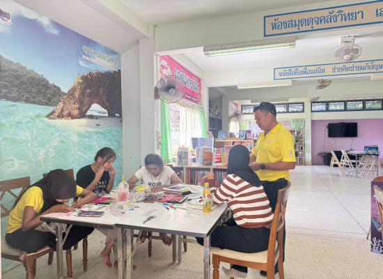 นายมรกต กันหนองผือ ผู้อำนวยการสถานศึกษา สกร.ร ะดับอำเภอละงู รักษาการในตำแหน่งผู้อำนวยการสถานศึกษา สกร. ระดับอำเภอทุ่งหว้า จังหวัดสตูล มอบหมายให้นางปาณิภา สุกใส ครูศูนย์การเรียนรู้ นำนักศึกษาศกร.ระดับตำบลทุ่งหว้า ร่วมทำกิจกรรม ทำพวงกุญแจที่คั่นหนังสือฟอสซ |
