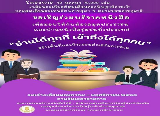 ห้องสมุดประชาชน อำเภอควนกาหลง จังหวัดสตูล ขอเชิญชวนประชาชนทุกท่านร่วมบริจาคหนังสือในโครงการ 70 พรรษา 70,000 เล่ม เพื่อเฉลิมพระเกียรติ สมเด็จพระกนิษฐาธิราชเจ้า กรมสมเด็จพระเทพรัตนราชสุดาฯ สยามบรมราชกุมารี