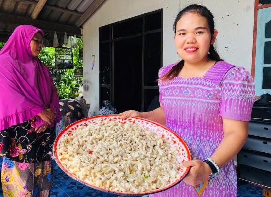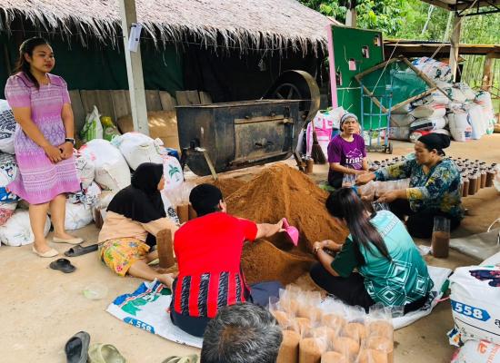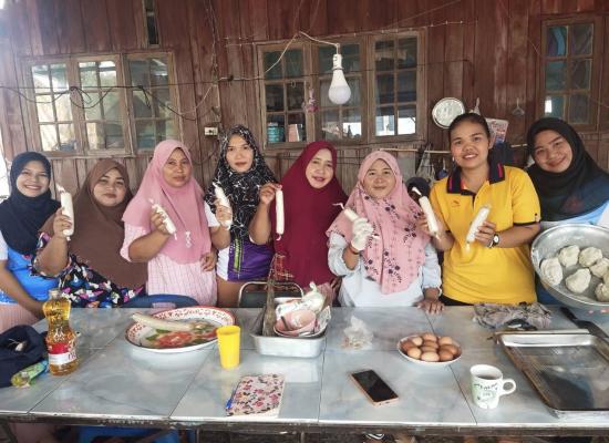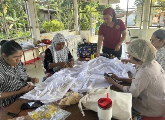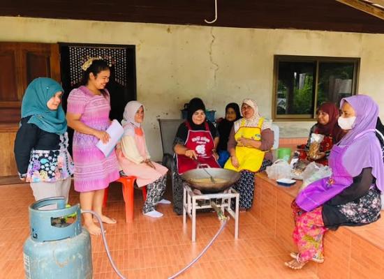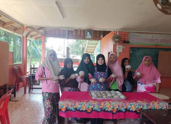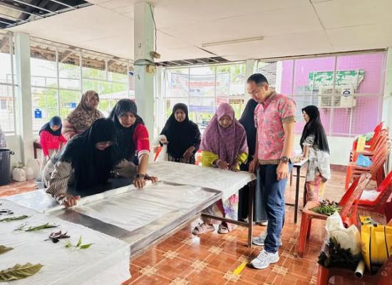 ศกร.ระดับตำบลบ้านควน เยี่ยมกลุ่มโครงการศูนย์ฝึกอาชีพชุมชน รูปแบบชั้นเรียนวิชาชีพ หลักสูตรผ้าพิมพ์เทียนมัดย้อมจากเปลือกไม้ยูคาลิปตัส