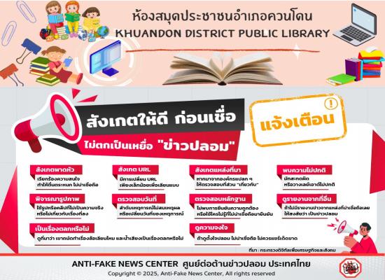 ห้องสมุดประชาชนอำเภอควนโดน จัดกิจกรรมส่งเสริมการอ่านออนไลน์ เรื่องเรียนรู้เท่าทันภัยในโลกออนไลน์ ป้องกันเด็กถูกหลอกลวง