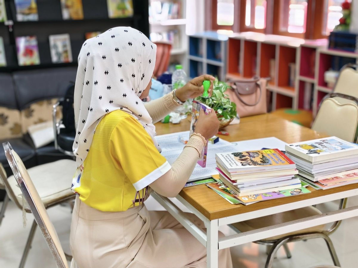 บรรณารักษ์ ห้องสมุดประชาชนอำเภอมะนัง ประทับตรา ลงทะเบียนสื่อ หนังสือใหม่