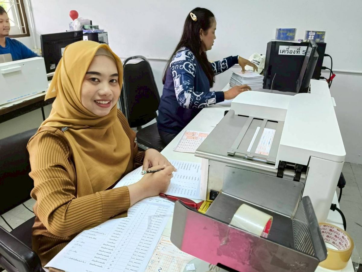 นายบุญนำ หมีนยะลา ผู้อำนวยการสถานศึกษา สกร.ระดับอำเภอมะนัง มอบหมายให้นางสาววรัญญา ลาเต๊ะ ครูศูนย์การเรียนรู้ ดำเนินการตรวจกระดาษคำตอบวัดผลสัมฤทธิ์สอบปลายภาคเรียน 1 ปีการศึกษา 2568