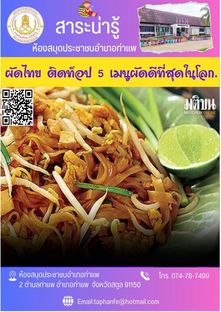 บรรณารักษ์ ส่งเสริมการอ่านผ่านสื่อออนไลน์ \"ผัดไทย ติดท็อป 5 เมนูผัดดีที่สุดในโลก\" การอ่าน เปิดประตูสู่ความรู้ที่ไม่สิ้นสุด
