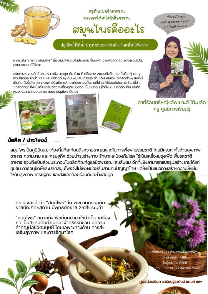 สกร.ระดับอำเภอท่าแพ ดำเนินการจัดกิจกรรม ส่งเสริมการวิเคราะห์ และการอ่านอย่างเป็นกระบวนการ โดยผู้บริหารและครูเป็นต้นแบบ ภายใต้กิจกรรมกิจกรรม \'\'Tell me more\" ประจำเดือนกันยายน 2568