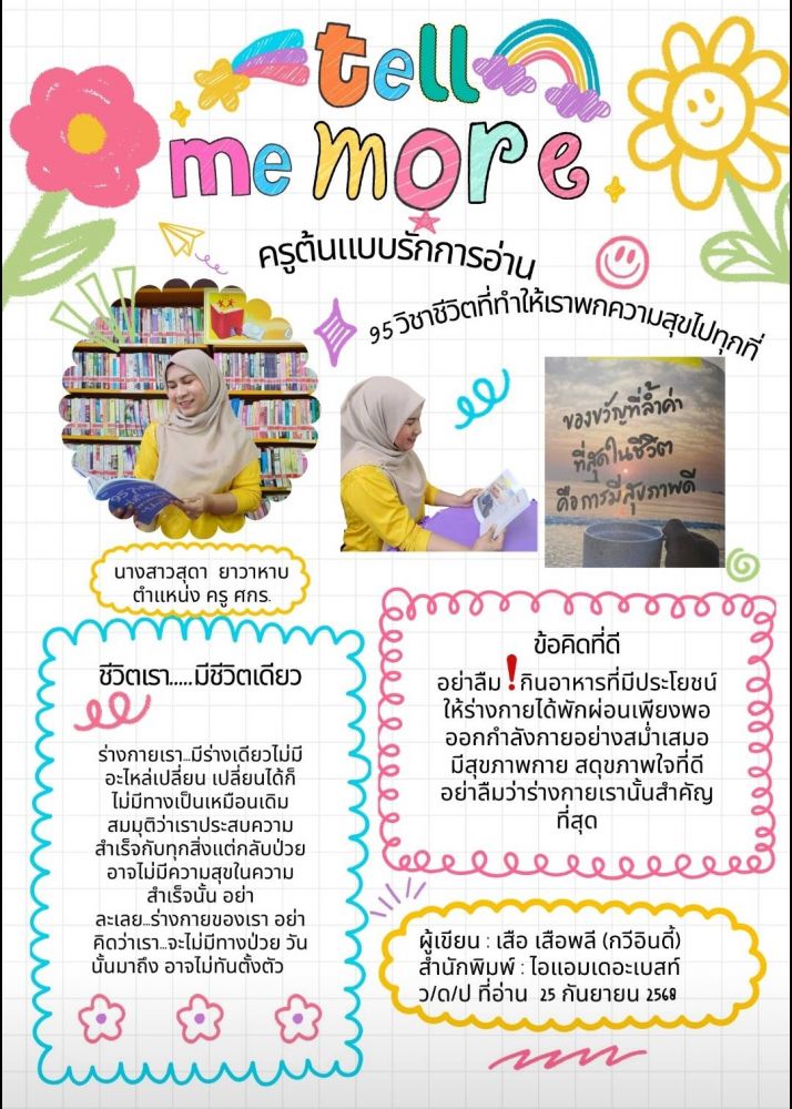 สกร.ระดับอำเภอท่าแพ ดำเนินการจัดกิจกรรม ส่งเสริมการวิเคราะห์ และการอ่านอย่างเป็นกระบวนการ โดยผู้บริหารและครูเป็นต้นแบบ ภายใต้กิจกรรมกิจกรรม ''''Tell me more" ประจำเดือนกันยายน 2568