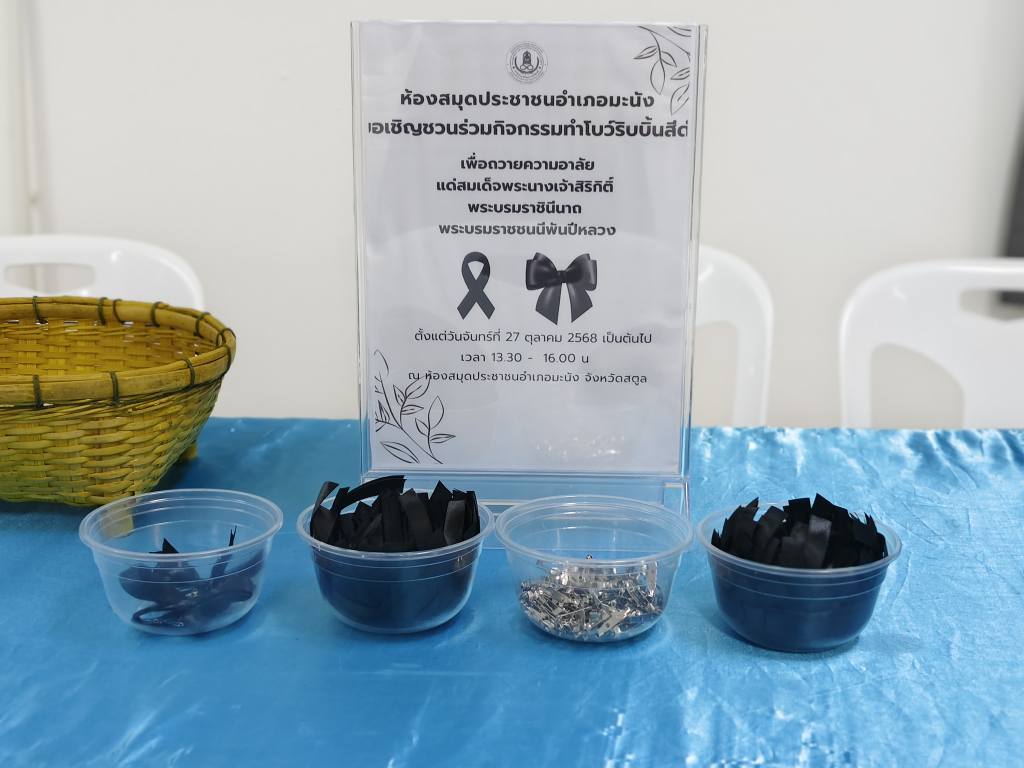 นายบุญนำ หมีนยะลา ผู้อำนวยการสถานศึกษาสถานศึกษาศูนย์ส่งเสริมการเรียนรู้ระดับอำเภอมะนัง มอบหมายให้นางสาวนริสรา พงค์หลง บรรณารักษ์ ลงพื้นที่สอนทำเข็มกลัดริบบิ้น และโบว์สีดำแก่ผู้เรียน เพื่อถวายความอาลัยแด่สมเด็จพระนางเจ้าสิริกิติ์ พระบรมราชินีนาถ พระบรมราชชนนีพันปีหลวง ณ ห้องประชุมภูผาเพชร ที่ว่าการอำเภอมะนัง ตำบลปาล์มพัฒนา อำเภอมะนัง จังหวัดสตูล