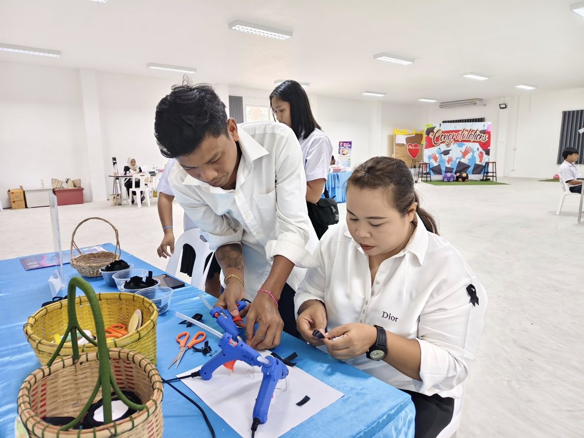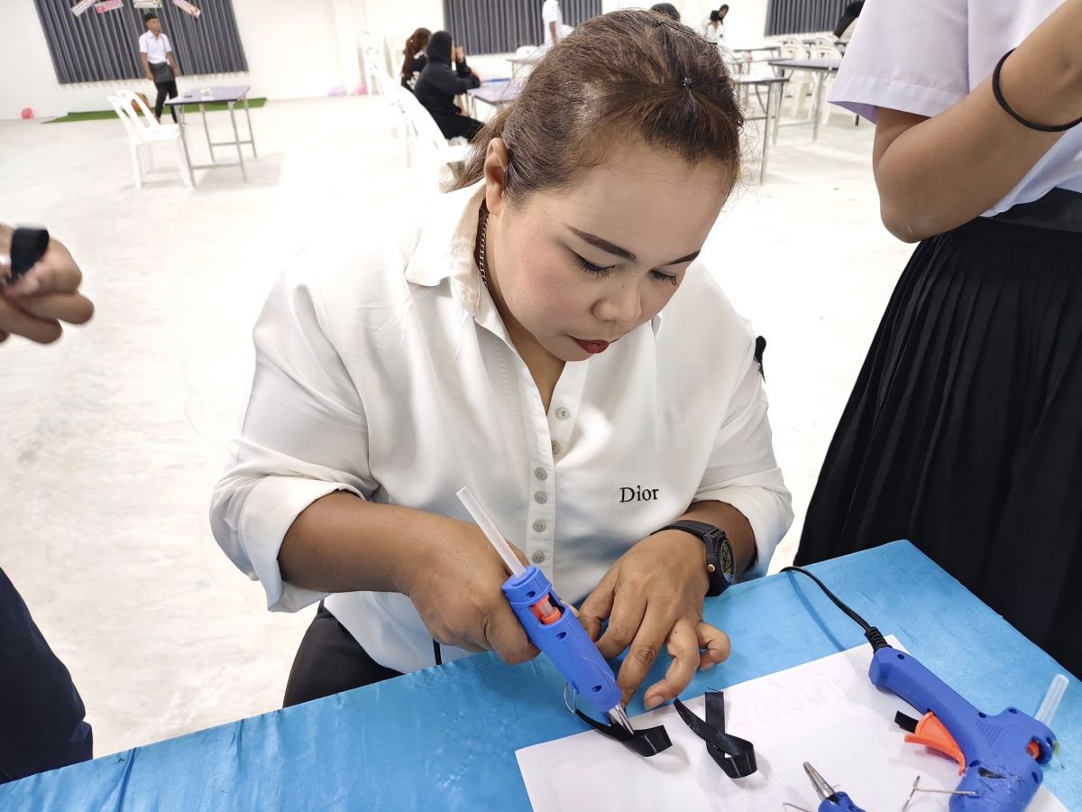 บรรณารักษ์ ห้องสมุดประชาชนอำเภอมะนัง ลงพื้นที่สอนทำเข็มกลัดริบบิ้น และโบว์สีดำแก่ผู้เรียน เพื่อถวายความอาลัยแด่สมเด็จพระนางเจ้าสิริกิติ์ พระบรมราชินีนาถ พระบรมราชิชนนีพันปีหลวง