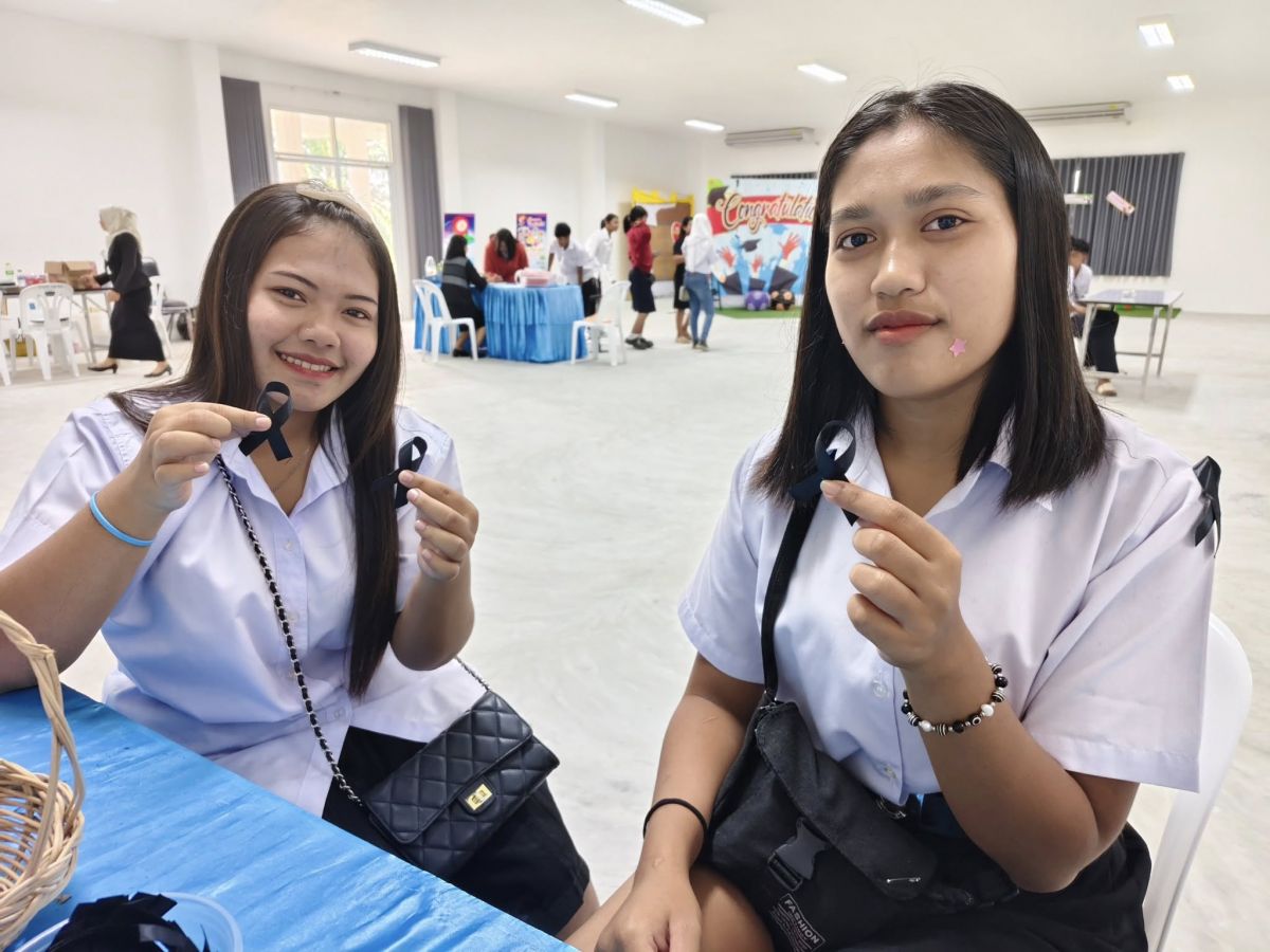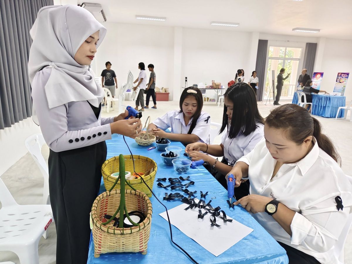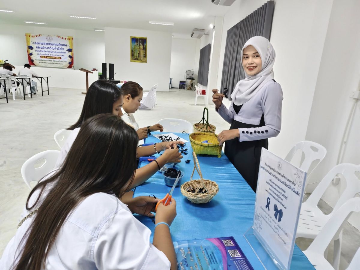 บรรณารักษ์ ห้องสมุดประชาชนอำเภอมะนัง ลงพื้นที่สอนทำเข็มกลัดริบบิ้น และโบว์สีดำแก่ผู้เรียน เพื่อถวายความอาลัยแด่สมเด็จพระนางเจ้าสิริกิติ์ พระบรมราชินีนาถ