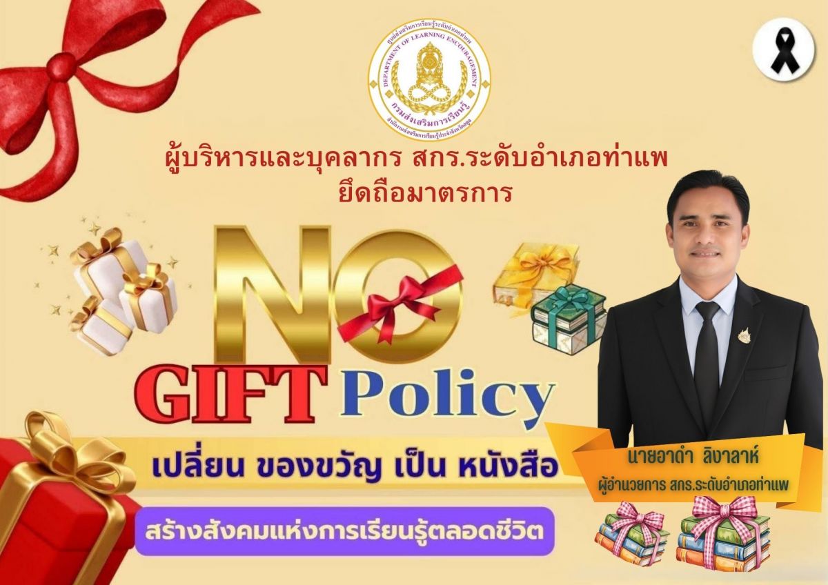 นายอาดำ ลิงาลาห์ ผู้อำนวยการสถานศึกษา ศูนย์ส่งเสริมการเรียนรู้ระดับอำเภอท่าแพ พร้อมบุคลากร สกร.ระดับอำเภอท่าแพ ร่วมรณรงค์ยึดถือ มาตรการ No GIFT Policy เปลี่ยนของขวัญเป็นหนังสือ เพื่อสร้างสังคมแห่งการเรียนรู้ เพื่อสนับสนุนส่งเสริมให้บุคลากร มอบหนังสือแทนการมอบของขวัญ