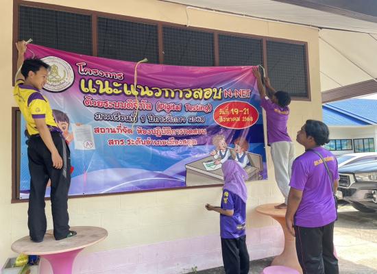 ศกร.ระดับตำบลเจ๊ะบิลัง เตรียมสถานที่กิจกรรมพัฒนาผู้เรียนโครงการแนะแนวการสอบ N - NET ด้วยระบบดิจิทัล (Digital Testing) ภาคเรียนที่ 1 ปีการศึกษา 2568