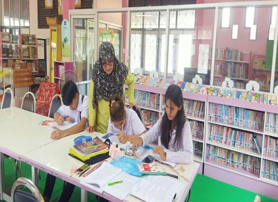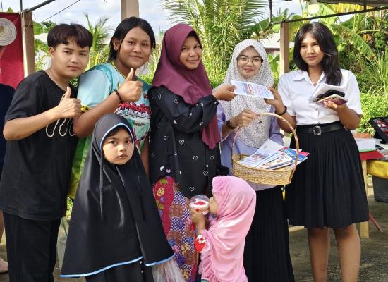 บรรณารักษ์ ห้องสมุดประชาชนอำเภอมะนัง ลงพื้นที่ส่งเสริมการอ่านห้องสมุดเคลื่อนที่สำหรับชาวตลาด ตะกร้าความรู้สู่ตลาด