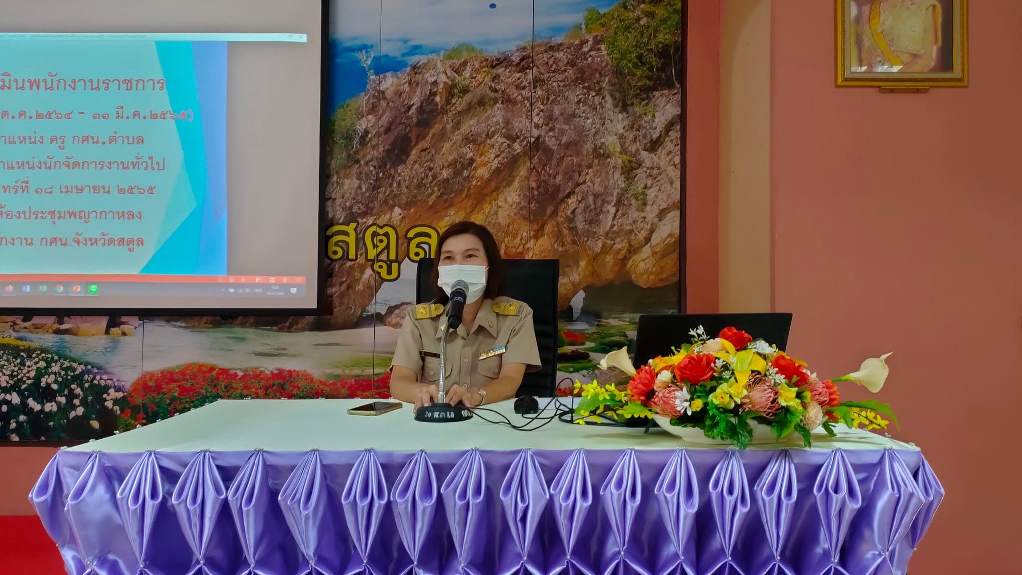 นางสาวมีนา เหล่ทองคำ ครู กศน.ตำบล เข้ารับการประเมินพนักงานราชการ ครั้งที่ 1 (1 ตุลาคม 2564 - 31 มีนาคม 2565) ตำแหน่งครู กศน.ตำบล โดยมี นางสาววิภานันท์ พุทธนุกูล ผอ.กศน.อำเภอเมืองสตูล นางสาวจตุพร ทหารไทย ครูชำนาญการ รักษาการในตำแหน่ง ผอ.กศน.อำเภอมะนัง และ นายทวีศักดิ์ แซ่เจน ครูชำนาญการ รักษาในตำแหน่ง ผอ.กศน.อำเภอควนกาหลง ร่วมเป็นคณะกรรมการประเมินในครั้งนี้ ณ ห้องประชุมพญากาหลง สำนักงาน กศน.จังหวัดสตูล