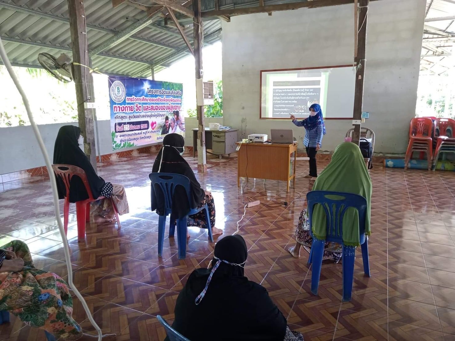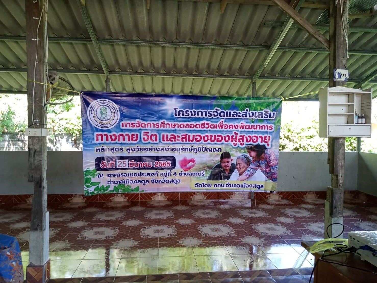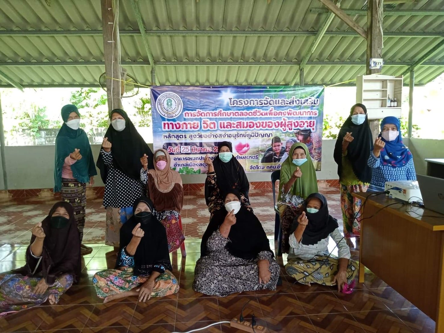 นางสาวมีนา เหล่ทองคำ ครู กศน.ตำบลเกตรี และนางยุเราะ สัญญา ครู อาสาสมัคร กศน.จัดโครงการการจัดและส่งเสริมการจัดการศึกษาตลอดชีวิตเพื่อคงพัฒนาการทางกายจิตและสมองของผู้สูงอายุ หลักสูตรสูงวัยอย่างสง่าอนุรักษ์ภูมิปัญญา สถานที่จัด ณ อาคารอเนกประสงค์ หมู่ที่ 4 ตำบลเกตรี อำเภอเมือง จังหวัดสตูล