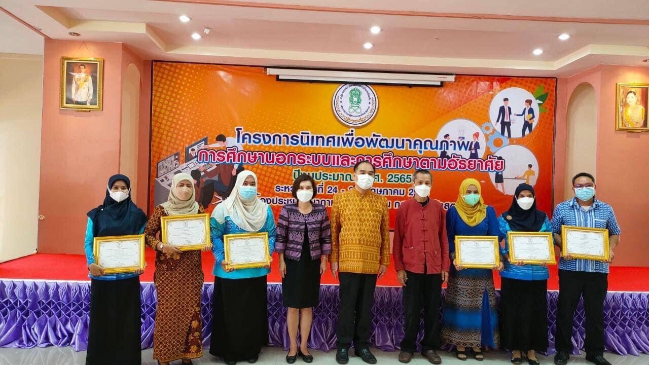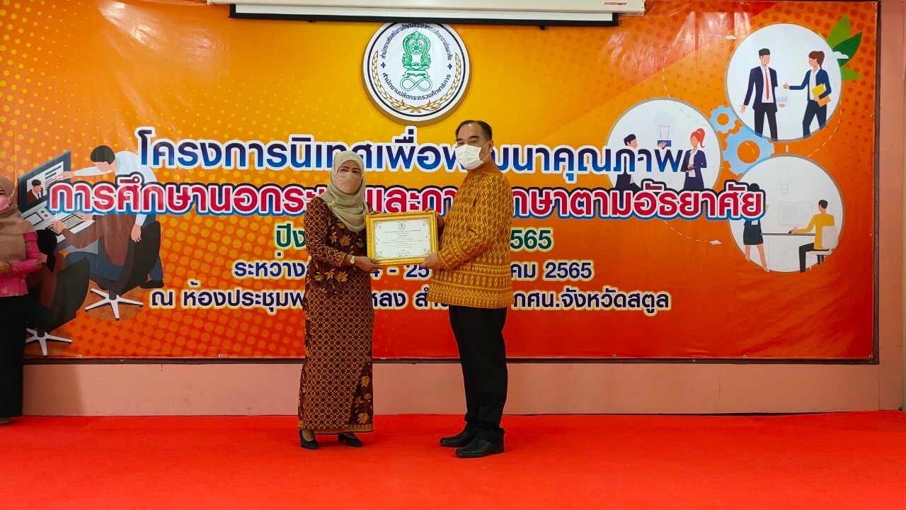 - ครูผู้มีผลงานทำให้นักศึกษามีผลคะแนนการทดสอบทางการศึกษาระดับชาติด้านการศึกษานอกระบบโรงเรียน (n-net) 100 ค ห้องะแนน ประจำภาคเรียนที่ 2 ปีการศึกษา 2564 ณ ห้องประชุมพญากาหลง สำนักงาน กศน.จังหวัดสตูล