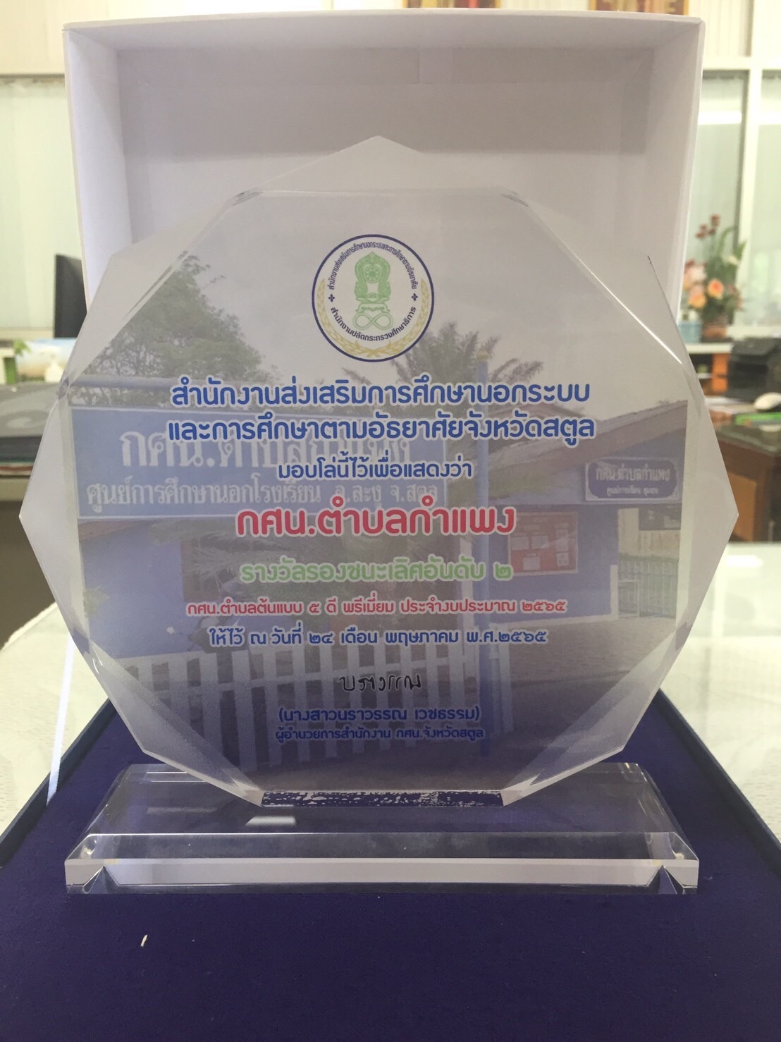 นายมรกต กันหนองผือ ผอ.กศน. อำเภอละงู มอบหมายให้ นางภัทรพร อุโหยบ ครูอาสาสมัคร กศน.ตำบลกำแพง เข้ารับโล่รางวัล กศน.ตำบลต้นแบบ 5 ดี พรีเมี่ยม ประจำปีงบประมาณ 2565 รางวัลรองชนะเลิสอันดับ 2 ณ ห้องประชุมพญากาหลง สำนักงาน กศน.จังหวัดสตูล