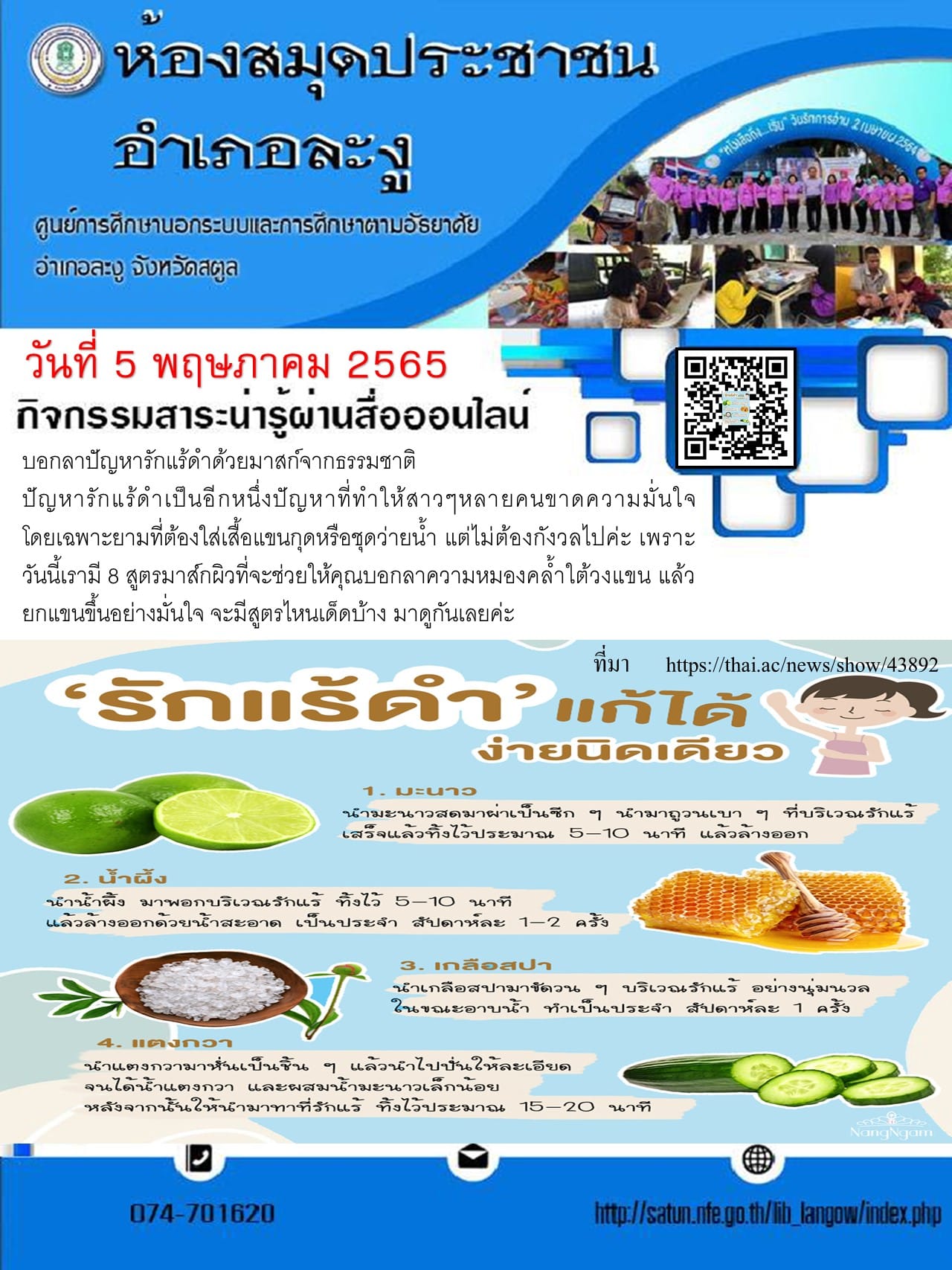 ห้องสมุดประชาชนอำเภอละงู จัดกิจกรรมส่งเสริมการอ่านออนไลน์ สาระน่ารู้ : เรื่อง รักแร้ดำแก้ได้ง่ายนิดเดียว