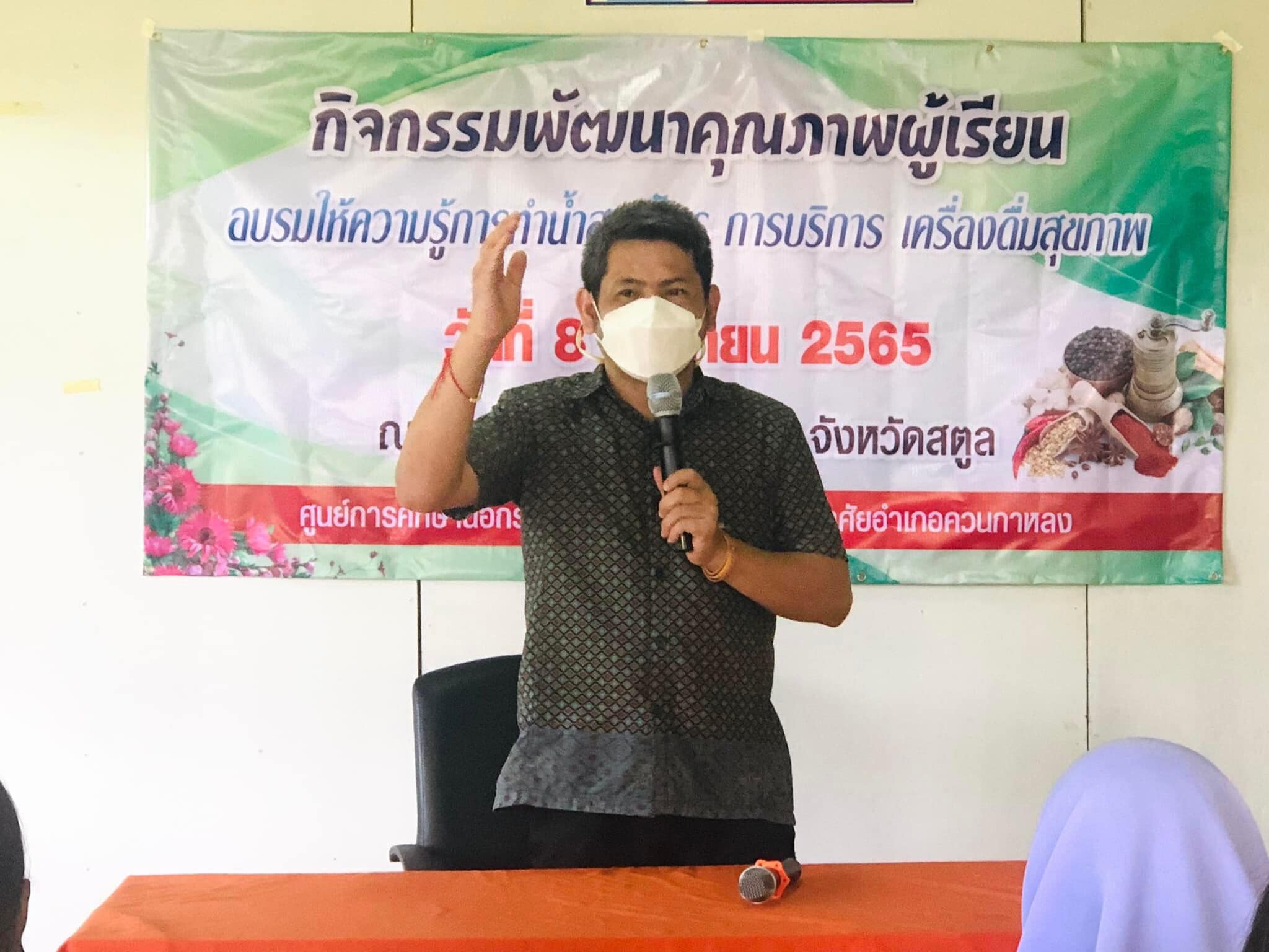 นายทวีศักดิ์ แซ่เจน ครูชำนาญการ รักษาการในตำแหน่งผู้อำนวยการศูนย์ กศน.อำเภอควนกาหลง มอบหมายให้นักศึกษา กศน.ตำบลทุ่งนุ้ยเข้าร่วมกิจกรรมพัฒนาคุณภาพผู้เรียนโครงการอบรมให้ความรู้การทำนำ้สมุนไพร การบริการ เครื่องดื่มสุขภาพ ณ กศน.อำเภอควนกาหลง จังหวัดสตูล