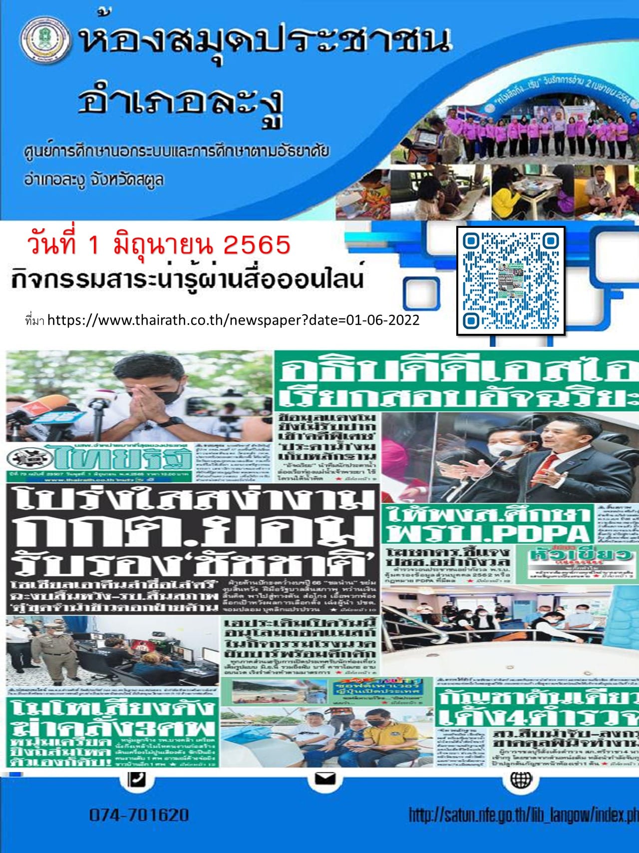 นางสาวทิตยสุดา จันทรเกษ บรรณารักษ์ ห้องสมุดประชาชนอำเภอละงู ได้รับมอบหมาย จาก นายมรกตกันหนองผือ ผู้อำนวยการศูนย์การศึกษานอกระบบและตามอัธยาศัยอำเภอละงู จัดกิจกรรมส่งเสริมการอ่านออนไลน์ อ่านก้าวทันโลก : เรื่อง ข่าวสารน่ารู้หนังสือพิมพ์ไทยรัฐวันที่ 1มิถุนายน 2565 เพื่อส่งเสริมการอ่านและการเรียนรู้ให้กับ เด็ก เยาวชน นักศึกษา กศน.และประชาชนทั่วไปได้ใช้เวลาว่างให้เกิดประโยชน์ ตลอดจนมีนิสัยรักการอ่านณ ห้องสมุดประชาชนอำเภอละงู
